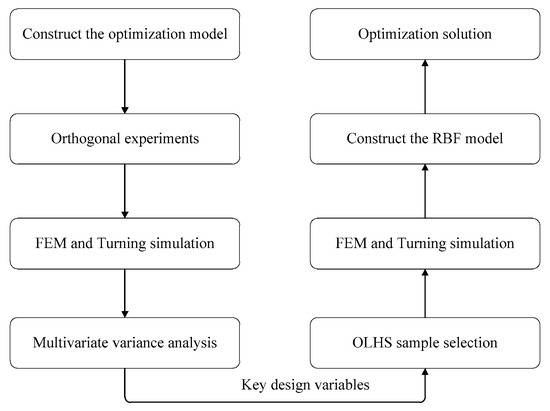 In order to further reduce the cost of the structural and turning parameters, the integrated optimization method was developed in this paper. Orthogonal experiments and multivariate variance analysis were used to reduce the dimension of optimization problems and improve the optimization efficiency. Through orthogonal experimental design, and utilizing ANSYS and AdvantEdge for finite element and turning simulations, samples and corresponding performance response values were obtained. Subsequently, multivariate variance analysis was employed to screen design variables, selecting those significantly impacting the objective and performance responses as optimization variables. Utilizing the selected design variables, optimal Latin hypercube sampling was employed to acquire sample points, and response values were obtained through simulation. Based on the OLHS samples and corresponding performance responses, the RBF model was constructed to fit the implicit relationship between design variables and responses. Finally, an integrated optimization model was established with total cost as the optimization objective, incorporating axle bridge structural parameters and turning process parameters as variables. The specific process is illustrated in Figure 8.