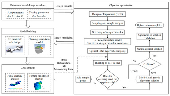 In order to keep the axle bridge strength and cutting force within the allowable range, and minimize the total cost of structure and turning processes, the RBF model and multi-island genetic algorithm were introduced in the integrated optimization of the axle bridge. The integrated optimization process is shown in Figure 11.