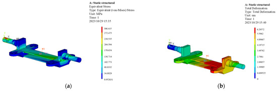 Nephogram of maximum stress and deformation: (a) maximum stress nephogram; (b) maximum deformation nephogram.