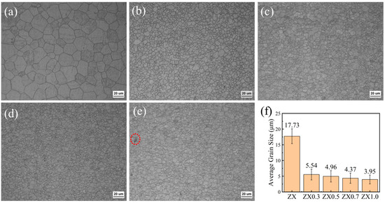Figure 2 shows the OM images of the extruded ZX composites. The study found that all five materials underwent complete dynamic recrystallization during extrusion, with no non-recrystallized zones detected. The average grain size of ZX alloy reaches 17.73 μm. With the addition of MgO, the microstructures of the composites are refined gradually. After the addition of 0.3 wt.% MgO, the average grain size of the ZX0.3 composite is reduced to 5.54 μm, which decreases by 68.6% compared to ZX alloy. Further increasing MgO contents, the refinement effect decreases, and the average grain sizes of ZX0.5, ZX0.7, and ZX1.0 composites are 4.96 μm, 4.37 μm, and 3.95 μm, respectively (Figure 2f). This indicates that incorporating MgO has a refinement efficiency for Mg alloys. This is similar to the results studied by Fan et al. [28], who believe that the diffusely distributed MgO facilitates non-homogeneous nucleation and promotes grain refinement. However, the effect of MgO contents on microstructure refinement is not significant (Figure 2b–e). Meanwhile, some suspected small-sized MgO agglomerates are found in the ZX1.0 composite and marked by the red circle, as shown in Figure 2e.