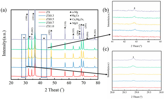 Figure 3 shows the XRD diffraction spectra of the extruded ZX composites, along with localized magnification of the diffraction peaks of the MgO (Figure 3b) and Mg2Ca (Figure 3c). As can be seen in Figure 3a, except for the diffraction peaks of α-Mg, diffraction peaks of the Mg2Ca phase, Ca2Mg6Zn3 phase, and MgO are also observed in these materials. The diffraction peak intensity of MgO is enhanced by increasing the MgO contents, as shown in Figure 1b. It shows the same variation for the intensity of Ca2Mg6Zn3 as well as the Mg2Ca phase (Figure 3c). It is noted that the diffraction peaks of the Mg2Ca phase and MgO are not found in the ZX alloy.