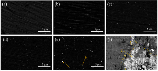 SEM images of extruded materials (a) ZX; (b); ZX0.3 (c) ZX0.5; (d) ZX0.7; (e) ZX1.0 and (f) shows the agglomeration of the MgO particles in the ZX1.0 composite. The MgO nanoparticles are gathered in the range of 6 μm and thus become the potential defects.