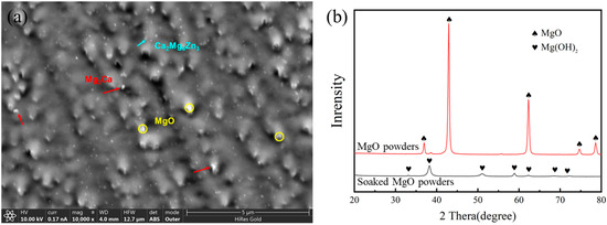 In addition, calculations based on Equation (3) demonstrate that the volume of MgO particles increases to approximately 2.2 times compared with their original size. Considering the fact that nano-MgO hydrolyzed easily and formed Mg(OH)2 when they were contacted with water during the sample preparation for SEM and TEM observation, the expansion of volume can be reasonably explained. Additionally, the EDS results indicated higher oxygen content in the larger particles. Therefore, we believe that a part of MgO may be transformed to Mg(OH)2 during preparation.