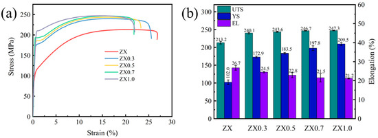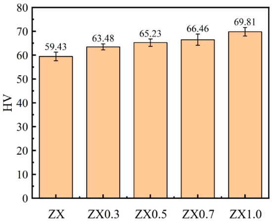 Figure 7 displays the Vickers hardness of extruded ZX composites. The microhardnesses of the extruded composites gradually increased with the increase of MgO contents, and they are 59.43 HV, 63.38 HV, 65.23 HV, 66.46 HV, and 69.81 HV for ZX, ZX0.3, ZX0.5, ZX0.7, and ZX1.0, respectively. The higher Vickers hardness values are mainly attributed to the reduced grain size and increased nanometer-sized second phase [32].