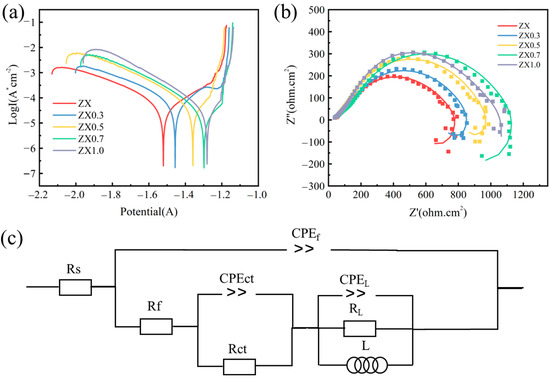 (a) Potentiodynamic polarization curve (b) impedance diagram, and (c) equivalent circuit diagram of extruded ZX composites.