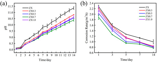 In order to further investigate the corrosion performance of the extruded materials, an in vitro immersion test in SBF is carried out for 14 days. Figure 10a shows the pH change curves of the extruded materials, and it shows an approximately linear growth trend for all the materials. In the initial immersion stage, within 2 days, ZX alloy exhibits a higher pH than other composites, whose pH is subequal. With increasing immersion times, the pH differences among the materials are enlarged. Therefore, the pH of ZX alloy is the highest during the whole immersion process, while for the composites, the pH increment is decreased gradually with the increase of MgO contents except for the ZX1.0 composite. The pH of ZX0.7 is the lowest after 4 days of immersion, and this is kept at a minimum until the end of the test. It is noted that the pH value of the ZX1.0 composite shows a rapid growth compared with ZX0.7 after immersion of 4 days. Figure 10b shows the average annual corrosion rate of extruded materials for different immersion times through the weight loss method. It can be seen from the figure that the average annual corrosion rate of the extruded materials gradually decreases with the increase in immersion time. This may be attributed to the protection of the gradually increased corrosion product layer. ZX0.7 composite exhibits the lowest corrosion rate throughout the whole immersion test and the average annual corrosion rate of the five materials is in descending order of ZX (0.99 g/m2/h) < ZX0.3 (0.84 g/m2/h) < ZX1.0 (0.82 g/m2/h) < ZX0.5 (0.8 g/m2/h) < ZX0.7 (0.77 g/m2/h) after immersion 14 days, which is consistent with the changing trend of the pH values.