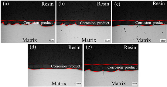 Figure 11 shows the corrosion cross-section of the extruded materials after 14 days of immersion. Figure 11a illustrates the non-uniform thickness of the corrosion layer between the dotted red lines in the ZX alloy and the large undulations in the corrosion interface. The addition of MgO gradually flattens the corrosion interface of the extruded composites, and there are no large corrosion pits in the matrix, indicating a relatively uniform corrosion. This reveals that the addition of MgO particles inhibits the local corrosion and improves the corrosion homogeneity of extruded ZX alloy. The average thickness of the corrosion product layer in the ZX0.3, ZX0.5 and ZX0.7 is similar, but then an increase is observed in the ZX1.0 composite. Moreover, local corrosion is reemerged in the ZX1.0 composite.