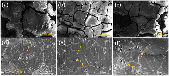 Figure 13 shows the SEM images of corroded surfaces of ZX alloy, ZX0.7 and ZX1.0 composites after 14 days of immersion. The surfaces of all specimens are covered by corrosion product layers, and the corrosion product layer on the surface of ZX alloy is divided into large blocks by wide and deep cracks. A large number of pitting can be observed on the surface of the corrosion product layer (Figure 12a). The magnified image shown in Figure 13d shows that the number of craters is significantly higher, and the surface is rougher compared to the other components. In addition, many areas are covered by bright white loose corrosion products and visible cracks. From the EDS results in Table 5, it can be seen that the elemental distributions in the dense region (point A, C and E) and loose corrosion product layers(square B and F, point D) are similar. In other words, the corrosion surface is still dominated by Ca-P deposits and Mg(OH)2. However, the protective effect of the loose corrosion layer on the substrate is greatly reduced. No corrosion product layer detachment is found on the surface of the ZX0.7 composite, and the corrosion layer is split into small blocks with narrow corrosion cracks running through them, as shown in Figure 13b. The surface of the composite is still relatively flat. Figure 13e shows the magnification microstructure of the corrosion product layer, and there is no loose corrosion product. Although there are a small number of microcracks on the surface, there is no shedding phenomenon. For ZX1.0 composites, the surface of the corrosion products became inhomogeneous with large fluctuations. It is divided into large blocks, and corrosion pits are also found, but the number of pits is small. Sparse areas can also be observed in the high-magnification image (Figure 13f) due to the detachment of the dense layer.