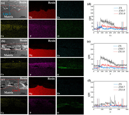 Cross-sectional SEM and EDS micrographs after immersion 14 days. (a–c) ZX, ZX0.7, ZX1.0 (d–f) Line scans result of the elements Ca, P and O.
