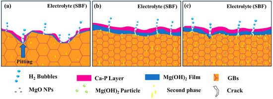 Figure 15 shows a schematic of the corrosion principle of the ZX alloy and ZX composites based on the above discussion. Firstly, the composites have high grain boundary density and uniform grain size, and the fine grains can promote the formation of a dense corrosion product layer, leading to the high corrosion resistance of the ZX composites. Secondly, with the addition of MgO, more precipitates are generated, and the moderate amount of diffusely distributed second phase is conducive to slowing down the corrosion. However, when the content of the second phase is too high, for example, in ZX1.0, the total volume fraction of the second is about 1.5%, which is 1.5 times higher than that of ZX0.7, these abundant second phases accelerate the overall corrosion rate of ZX1.0. Thirdly, the Mg(OH)2 particles formed by the reaction between MgO and the SBF solution sealed the cracks of the corrosion product layer, effectively preventing the penetration of the corrosion medium into the Mg matrix along the cracks. Ultimately, the reduction in the corrosion rate means a reduction in the rate of hydrogen release, and this effectively reduces the accumulation of hydrogen in the cracks of the corrosion product layer and the destructive tendency of hydrogen bubbles to the corrosion product layer. This ensures that the corrosion product layer can cover the surface of the specimen for a long time and protect the matrix, whereas, for the ZX1.0 composite, the local agglomeration of MgO particles becomes a defect and is easily eroded by the destructive ion.