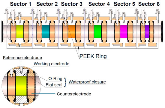 From the electrochemical point of view, finite element method (FEM) simulations of the electric field in the environment of the WE were carried out. The objective was to establish the optimal size of the electrodes and the insulating ring elements, seeking the optimization of two fundamental effects: (i) reduction in the edge effect and (ii) reduction in the non-useful area of the electrode, which can contribute to the distortion of the electrochemical measurements. Taking the electrical field distribution obtained by FEM as a reference, the segments are in the form of rings with an optimal width of 15 mm and they are manufactured using the alloys that have been previously selected (Table 3) on which the electrochemical measurements will be performed (WE). On both sides of each metallic WE, two AISI 316 stainless steel CE rings are placed with the same geometry and 15 mm width. This disposition was selected to obtain a proper distribution of the electric field over each WE during the measurement. The total surface area of the CE (2600 mm2) is twice that of the WE ring (1300 mm2); thus, the current density passing through the CEs will be lower than on the WEs. As the measurement performed on the WE is non-destructive, the lower current density on the CEs corresponds to a non-destructive test.