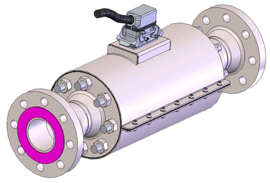 The main cylindrical body is protected by a metal casing (duplex stainless steel). This casing was designed to confine the testing materials and withstand the stress of the pressure exerted internally by the geothermal fluid, as shown in Figure 4. A second casing of duplex stainless steel is placed above this to prevent leakages and to protect the electrical connections from the aggressive environment generated in the geothermal plant. To ensure a watertight connection between the test section and the peripheral electric elements, a special connector is used.