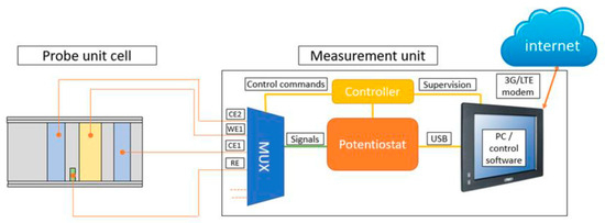The controller is responsible for managing the activation of the multiplexer and coordinating it with the measurements made by the potentiostat. Its operation is autonomous but supervised by the measurement software running on the control PC. The control PC is responsible for the software execution and the measurement monitoring and it has an interface to visualize the current state of the system, configure the measurements, record the events, and store the measurements. The 3G/LTE modem provides internet connectivity to the measurement system, allowing it to be saved to the cloud as soon as they are registered and it can be downloaded remotely in the office for safekeeping.