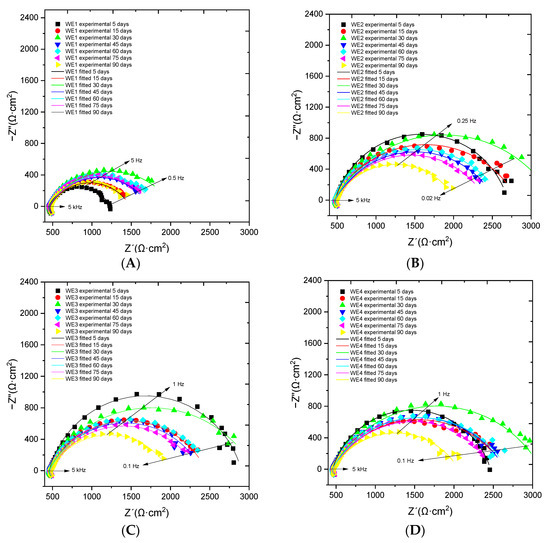 Nyquist plots corresponding to the first 90 days of exposition for (A) WE1 (Inconel 625), (B) WE2 (SMO254), (C) WE3 (DSS14410), and (D) WE4 (AISI316).