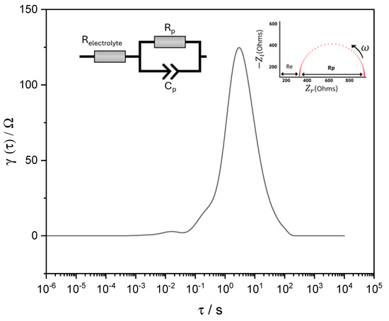 For a more detailed analysis and a deeper discussion of the time evolution, EIS was fitted using equivalent circuits. These spectra could be successfully fitted to a standard Randles equivalent circuit (R-RC) (Figure 11) [36]. This circuit is one of the simplest possible models describing processes at the electrochemical interface composed of a first pure resistance, associated with the electrolyte resistance (Re), followed by a resistance in parallel to a capacitance (R1C1). These two elements correspond to the polarization resistance (R1 = Rp) and to the double-layer capacitance (C1).