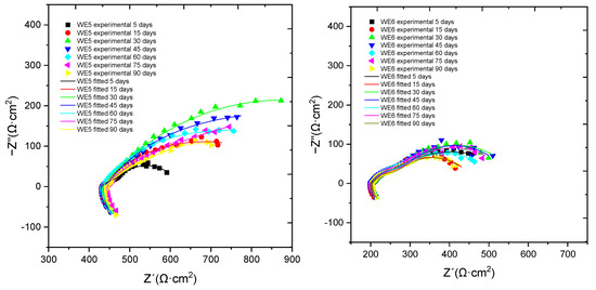 Nyquist plots corresponding to the first 90 days of exposition for WE5 (PG265H) (left) and WE6 (K55) (right).