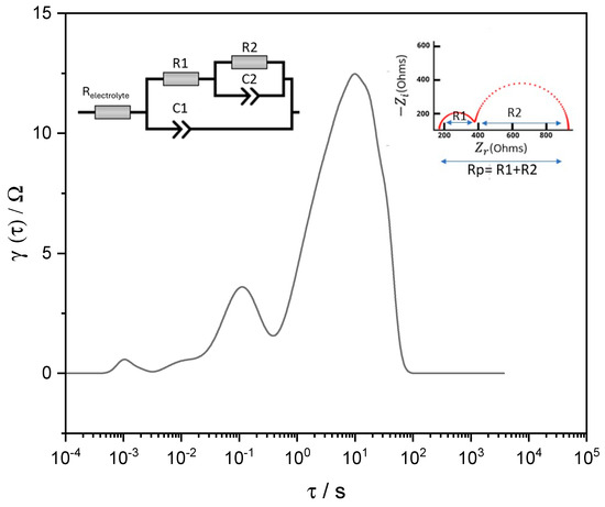DRT for the WE5 spectrum and ladder-type circuit for the fitting of the two-time constants identified in the Nyquist plots of WE5. Rp calculation by Nyquist plot.