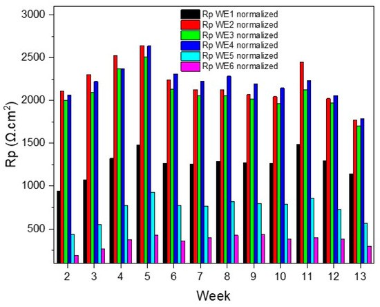 Figure 14 shows the Rp evolution during the first three months. Rp average values are represented for each WE during different weeks. According to the previous results, WE5 and WE6 presented the lowest Rp values, being the K55 the least corrosion-resistant steel.