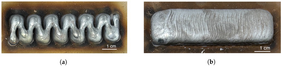 After the dataset was designed, the parameter combinations were printed for evaluation using a Fronius TPS400i welder (Fronius, Pettenbach, Austria) with an ABB IRB 2600 robot (ABB Ltd., Zürich, Switzerland) and a gas mixture of 98% argon and 2% CO2. Instead of maintaining a constant current and voltage, a specialized technique called “cold metal transfer” was implemented. This approach, developed by Fronius, uses a modified short-circuit welding process to synchronize the waveform with the mechanical motion of the wire. This process contributes to a controlled and precise material deposition during the additive manufacturing process.