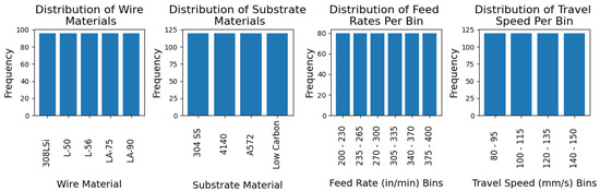 This sampling was performed to encompass the full range of processing parameters with fewer repeated values. By selecting from a range of values within a bin instead of using the same value every time, variability was introduced into the dataset, enabling improved model performance and generalizability for future machine learning models. While pseudo-randomly selecting values introduced variability into the dataset, constraining selection to bins ensured the resultant dataset remained balanced with the same number of entries per bin, as shown in Figure 4. However, even though the distribution per bin was guaranteed to be balanced, the distribution of values within a given bin were not for two main reasons. First, the number of unique values within a feature may not be perfectly divisible by the number of bins, as was the case for the feed rate and travel speed. As a result, one of the bins had fewer values, causing the values in this bin to be selected more frequently. Second, due to the inherent random nature of the generation process, some values were repeated more frequently, leaving others less frequent. Figure 5 and Figure 6 highlight this phenomenon, in which Figure 5 and Figure 6 were both perfectly balanced at the bin level. Despite being balanced at the bin level, the number of occurrences of each individual value in Figure 6 was visibly less balanced than Figure 5. To quantify this difference, in the more-balanced dataset, as shown in Figure 5, the number of occurrences of a given value in the feed rate occurred between 8 and 17 times, a range of 9 occurrences. In contrast, for the less-balanced use case, the number of occurrences varied from 4 to 24, with a range of 20 occurrences.