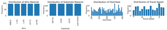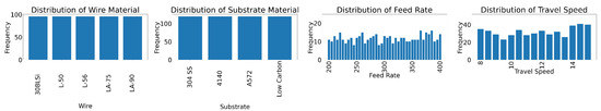 This work analyzes the impact of four input parameters (wire material, substrate material, wire feed rate, and travel speed) on the resultant bead’s shape (width and height). For the evaluation, there were 40 options for the wire feed rate and 17 for the travel speed, in addition to five selected wire compositions and four selected substrate compositions, as shown in Table 1. Exhaustively collecting every parameter combination would require 13,940 samples (41 wire feed rates × 17 travel speeds × 5 wires × 4 substrates), which our facilities could not accommodate.