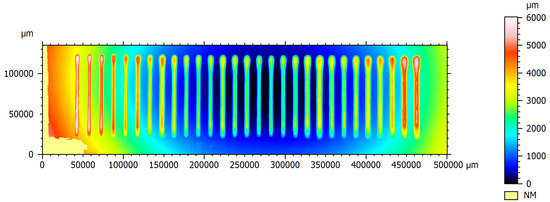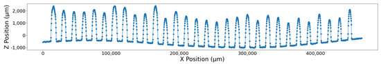 Once printing each parameter combination was completed, an Artec Space Spider 3D Scanner (Artec 3D, San Diego, CA, USA) was used to measure each bead. This high-resolution 3D scanner utilizes structured blue light technology to capture and render complex geometric shapes. This scanner is specifically designed for quality and control engineering and is ideal for small objects with intricate detail, as was the case here. The 3D scanner automatically saved all scans using an A3D file format. While this format is common for 3D models, it was difficult to extract the necessary information from it. The 3D models were converted to Standard Triangle Language (STL) files, a more-common file type that was easier to work with. STL files are made up of a collection of points that form a mesh of connected triangles to model the shape of an object. Once converted, it was possible to extract the necessary information from these STL files. However, due to the structure of interwoven triangles forming a mesh, this would require quite a bit of processing. As a result, a surface metrology software called MountainsMap 9.1 from DigitalSurf (Besançon, France) was used to extract and analyze surfaces. This software enabled us to analyze the surfaces of each plate. Additionally, using MountainsMap, the surface of each 3D model was represented as a point cloud matrix with constant sampling in the X and Y direction at 0.25 mm intervals, which made it much simpler to extract the desired target variables from.