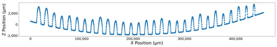 With plates scanned and surfaces extracted, as shown in Figure 7, extracting the widths and heights required identifying local extrema (minimums and maximums). However, this process was challenging for three main reasons. First, the plates on which the beads were printed were physically warped due to the heat input during the printing, as shown in Figure 8 and Figure 9. Second, the magnitude and shape of each plate’s curve was inconsistent. As shown in Figure 8 and Figure 9, the plate represented by Figure 8 has a steeper, binomial curve, whereas the plate represented by Figure 9 has a shallower, cubic curve. Lastly, since these plates were measured with a precision of 0.0001 ms in the Z direction, they were not very smooth, creating local extrema, which did not represent the peak or base of the bead.