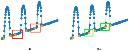 Improved extrema detection for calculating width and height by including the slope in consideration. (a) Issues from naive solution of identifying base points of beads due to curve. (b) Improved solution to identify base points of beads using the slope.