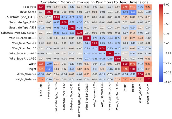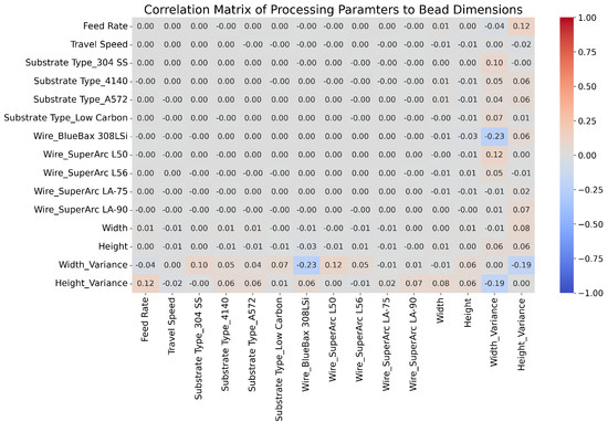 The analysis of the linear correlations between the input features and target variables confirmed the conclusions reached by Dinovitzer et al. [20] and from the visual analysis in Section 4.1 of this study. As found by Dinovitzer et al. [20], bead width was negatively associated with travel speed (−0.49 out of −1), while bead height was positively correlated with feed rate (0.55 out of 1). Further examination revealed that bead width had an even stronger positive correlation with feed rate (0.78) than bead height (0.55), and bead height had an even stronger negative correlation with travel speed (−0.71) than bead width (−0.49). Evaluating the impact of the feed rate on all dependent variables showed positive correlations with width (0.78), height (0.55), and height variance (0.49), but a negative correlation with width variance (−0.30). In contrast, there was no correlation between travel speed and width variance (0.05) and only a small correlation with height variance (−0.10). In addition to the impact of feed rate and travel speed, correlations between materials were also identified, indicating an impact on geometry. For example, BlueBax 308LSi had a positive correlation with width variance (0.23), whereas SupeArc L56 had a negative correlation (−0.15). This would indicate that, while feed rate and travel speed are the most-important factors impacting bead geometry, the material is also relevant and must be considered.