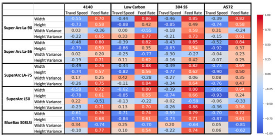 In addition to measuring the pairwise correlation between individual processing parameters and materials on bead geometry, the impact of inter-correlated features was also evaluated. Specifically, an analysis was performed to identify how changing the wire and substrate material impacted the correlation between travel speed and feed rate on width, height, width variance, and height variance, as shown in Figure 14. Based on these results, it was concluded that there was an interrelated nature between materials and processing parameters and how they impacted bead geometry. For example, while feed rate had a consistent positive correlation with width, the magnitude of this correlation varied. Looking at beads deposited on A572 steel substrates, depending on the wire used, this correlation ranged from 0.64 (Super Arc L50) to 0.84 (Super Arc La-56). In contrast, when using 304 stainless steel for the substrate, this separation was much tighter, ranging from 0.79 to 0.88. However, in some cases, a change of material did not only impact the closeness of the values, but actually inverted them. For example, when using the Super Arc LA-90 wire, there was a linear correlation between the feed rate and width variance of −0.36, −0.55, and −0.24 for the 4140, low carbon, and A572 substrates, respectively. However, when using the same wire on 304 stainless steel, the correlation was +0.58, a significant shift from the other substrates, which was not observed with the other wires.