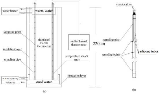 Figure 1a shows a cross-section of the marine thermocline simulator (MTS). The MTS primarily included four parts: a heat preservation bucket, a temperature control unit, a temperature measurement unit, and a sampling tube. The temperature control unit contained a water heater, a water-cooling machine, a warm water tank, and a cool water tank. The warm water tank was fixed at the top of the MTS, which was used to keep the upper part of the SMT at a relatively high temperature. The cool water tank was fixed at the bottom of the MTS, which was used to keep the lower part of the SMT at a relatively low temperature. The temperature measurement unit contained a multichannel thermometer and a temperature sensor array. Figure 1b shows a cross-section of the sampling tube, which was used to take seawater samples for analysis.