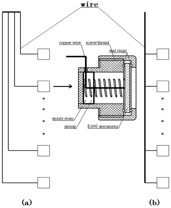 Removable and-chain-type wire beam electrodes (RCWBEs) [28] were used to understand the corrosion of the steel specimen with the aid of the wire beam electrode (WBE) technique. The RCWBEs were used to simulate the long metal in the SMT and consisted of many individual electrodes with an adjacent separation of 15 cm. The individual electrode was fabricated from an E690 steel specimen, rubber ring, PVC screw, and wires. Figure 2a,b show the two types of RCWBE in response to different purposes: “A”, used for electrochemical measurements, and “B”, used for morphological observation and corrosion weight loss rate measurements.