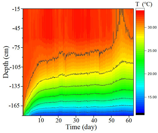 Figure 3 shows the longitudinal temperature variation in the SMT. From day 0 to the 7th day, the temperature at the bottom points changed markedly. A stable and strong temperature gradient first appeared on the 7th day and lasted until the 66th day. After the 7th day, the multilayer structure of seawater formed and remained stable. The temperature of the upper seawater layer was 32 °C, and that of the lower seawater layer was 12 °C. The range of temperature variation in the SMT was similar to that in the marine thermocline in the northern area of the South China Sea (NSCS) in summer. In summer, the surface temperature increases from northeast to southwest, ranging from 28.2 to 30.7 °C in the NSCS. In summer, the average upper to lower boundary depth of the thermocline in the NSCS is about 18–56 m (thickness: 38 m) on the shelf and 32–129 m (thickness: 97 m) beyond the shelf; the temperature gradient in our simulated thermocline was 0.21 °C m−1 on the shelf and 0.12 °C m−1 beyond the shelf [30]. The thermal distribution of the thermocline in the NSCS beyond the shelf was thus simulated using the SMT.
