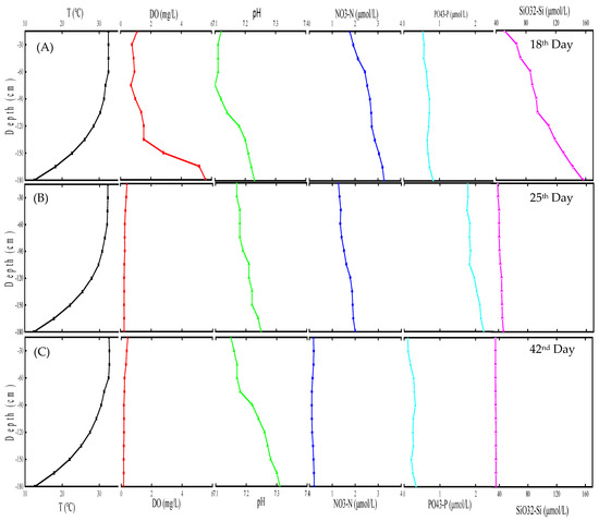 Figure 4 shows the component variations in the SMT. On the 18th day, the DO increased with increasing seawater depth. The DO of the upper-layer seawater decreased from 1.09 mg/L on the 18th day to 0.42 mg/L on the 25th day. The DO of the bottom seawater decreased from 5.60 mg/L to 0.24 mg/L. The DO decreased with increasing seawater depth on the 25th and 42nd days. The variation in DO in the SMT showed a stable multilayer structure formation. There is a small quantity of biodetritus in natural seawater. As shown in Reaction (2), the biodetritus slowly decomposed into inorganic substances and simultaneously consumed the DO. The decomposition reaction of biodetritus is influenced by temperature. Before the 18th day, the DO consumption rate in the warm and upper seawater was higher than that in the cool and bottom seawater. The O2 transmission is subject to the stable multilayer structure of the thermocline: