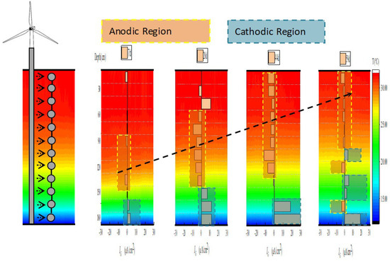 If a lengthy steel structure traverses the marine thermocline, the galvanic corrosion of steel is primarily driven by variations in its electrochemical potential at different depths. As shown in Figure 6c, the continuous reduction in Ecorr with depth contributed to large-scale galvanic corrosion, and the oscillation variation of Ecorr with depth was the reason for small-scale galvanic corrosion: