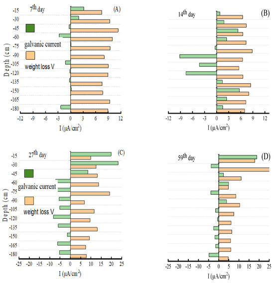 Comparison of galvanic current and average corrosion rate: (A) the 7th day; (B) the 7th day; (C) the 27th day; (D) the 59th day.