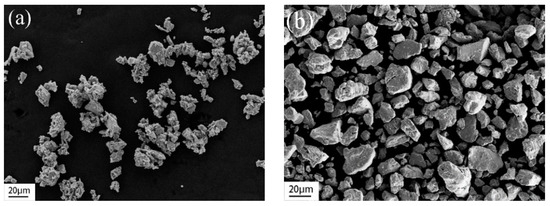 The microstructures of NaCl and Ni50Mn28Ga22 alloy powder are depicted in Figure 1a and Figure 1b, respectively. The NaCl powder displays an irregular shape with a size range of 20–30 μm after grinding and screening, with a few particles being smaller than 10 μm. Similarly, the alloy powder exhibits irregularity at a size of 20–30 μm.