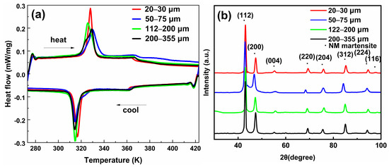 (a) DSC curves and (b) XRD patterns of Ni50Mn28Ga22 porous alloy.