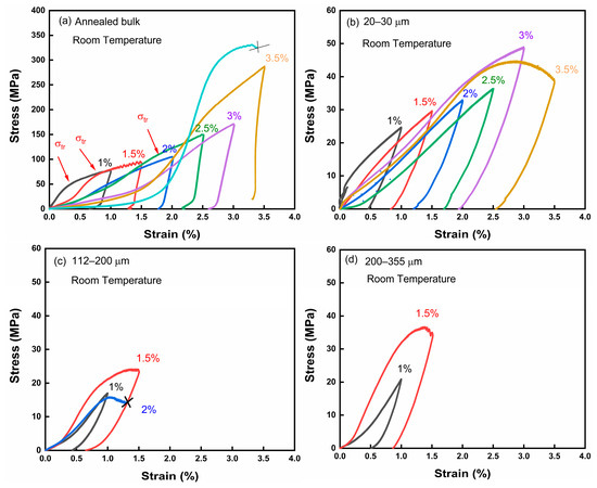 The mechanical properties of magnetocaloric materials are of crucial importance for their potential applications. The Af temperature of the samples, as depicted in Figure 3a, was approximately 340 K. Therefore, shape memory effect tests were conducted at room temperature (295 K), wherein the samples were in a completely martensitic state. The comparison between the annealed bulk alloy and porous alloys with different pore sizes (20–30 μm, 112–200 μm, and 200–355 μm) is illustrated in the compression experiment results shown in Figure 4. The sample underwent compression experiments using a cyclic increment method, wherein it was first subjected to a compression recovery of 1%, followed by heating at 473 K for 10 min to achieve shape memory recovery. Subsequently, after the sample cooled down, the next compression process was initiated. Each compression process increased the compression amount by 0.5% compared to the previous one until the sample eventually collapsed.