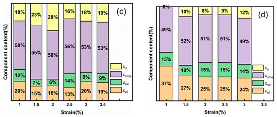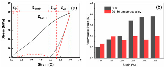To better analyze the phase transition process during the sample recovery stage, the recovery rate of each strain component of the annealed bulk and 20–30 μm porous alloy specimen are illustrated in Figure 5. The compression strain during each load–unload–heat recovery cycle comprises four components: elastic recovery strain εel, superelastic recovery strain εse, shape memory effect (SME) strain εsme, and irrecoverable strain εir, where the total strain εsum is the sum of these individual components, as shown in Figure 5a [18] and the following formula: