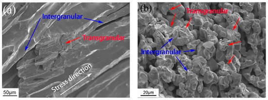 To further analyze the fracture process of the alloy, the fracture of the annealed bulk alloy and the 20–30 μm porous alloy were examined. Due to the inherent brittleness of the bulk NiMnGa alloy, most of the fracture surface was an intergranular fracture (Figure 6a), which aligned along the stress direction. There was also a small amount of transgranular fracture. In contrast, Figure 6b reveals a combination of intergranular and transgranular fractures on the porous alloy’s fracture surface. Notably, most of the intergranular fractures resulted from weak sintering necks, while well-sintered sintering necks exhibited transgranular fractures. It is obvious that the stress threshold for an intergranular fracture is lower than that for a transgranular fracture. Consequently, stress initially triggers the fracture of weak sintering necks in porous alloys and then concentrates on the grain of the alloy pillar, causing a transgranular fracture. Therefore, enhancing the strength of the sintering neck in porous alloys can significantly enhance their overall strength.