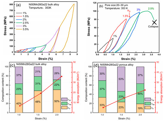 Cyclic compressive stress–strain curve at 353 K of (a) Ni50Mn28Ga22 bulk alloy and (b) Ni50Mn28Ga22 porous alloy with a pore size of 20–30 μm. Corresponding recovery ratio of each strain component curve of (c) annealed bulk alloy and (d) porous alloys.