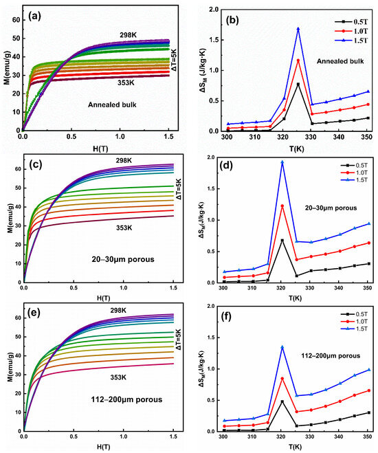 The temperature-dependent ΔSM for annealed bulk and porous alloys with different porous sizes is shown in Figure 8b,d,f,g, respectively. A common characteristic of the samples was that the magnetic entropy change ΔSM value of the alloy increased gradually with the increase in the magnetic field, and there was a peak in the transformation temperature region. The origin of the large ΔSM peak in Ni50Mn28Ga22 could be attributed to the considerable magnetization jump caused by the phase transformation between martensite and austenite during heating. This is due to the large difference in magnetization between the high temperature austenite phase and the low temperature martensite phase, resulting in the alloy having the largest magnetic entropy change near the transformation temperature. Moreover, the magnetic entropy of alloys with a pore structure in the same magnetic field was larger than that of bulk alloys. Specifically, the magnetic entropy changes in the ΔSM of bulk and porous alloys with different pore sizes obtained under a 1.5 T magnetic field were 1.68, 1.93, 1.35, and 1.89 J/kg·K, respectively. This indicates that the porous alloy exhibited a better magnetocaloric effect under the same conditions. This may be attributed to the fact that the porous structure reduces the number of grain boundaries, thereby reducing the resistance to domain movement. Additionally, as a magnetic cooling material, the existence of a large number of through-holes can also increase the internal and external heat exchange efficiency of the material, thereby improving the magnetothermal refrigeration efficiency [46,47].