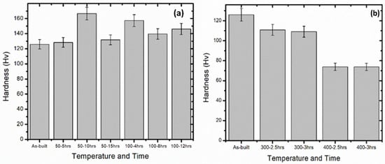 - In this investigation, there is a justification that the age-hardening thermal treatment modifies the mechanical characteristics of AlSi10Mg constructively. There, the microstructure did not change, which was the key objective sought to be achieved for this investigation. This is observed with all samples age-hardened at temperatures of 50 °C and 100 °C for all variations in hours; even though the samples age-hardened at 50 °C for 10 h stand out as the most successful thus far in terms of hardness enhancement of 166 Hv, the rest of the age-hardened samples demonstrated a considerable hardness increase.