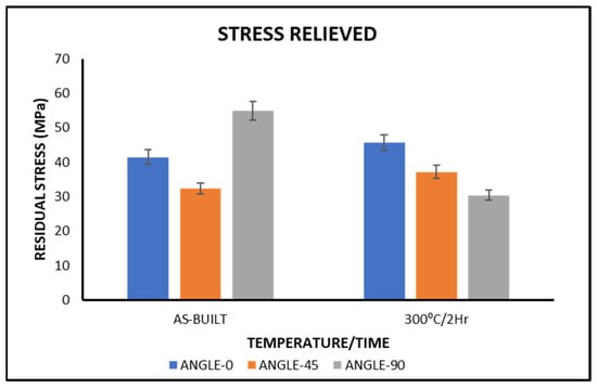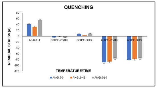 - It was observed that the residual stress was reduced to compressive residual stress at 400 °C to below 50 MPa and, for samples ice-quenched at 300 °C, the residual stress was reduced to slightly above 0 MPa, which tells us that the thermal treatment technique is effective at reducing residual stresses despite compromised mechanical characteristics.