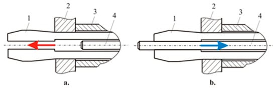 The tool insertion is facilitated by the front conical surface on the working part of the split mandrel (Figure 2a). Clearance exists between the cylindrical base surface of the mandrel and the surface of the hole, except for those holes that are drilled at the lower limit of their diametrical tolerance range. The conical–cylindrical pin is moved axially with respect to the mandrel to the left such that its conical surface does not contact the conical surface of the hole in the mandrel (Figure 1a). This allows elastic deformation of the split mandrel segments in a radially inward direction, facilitating the introduction of the mandrel into the pre-drilled hole in the workpiece.