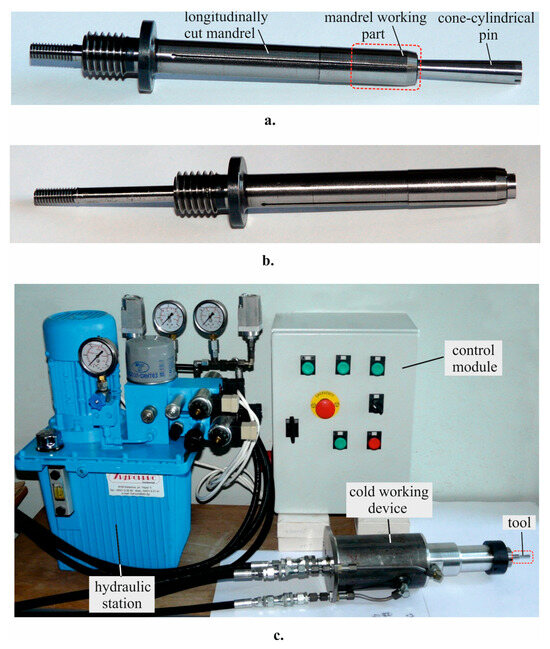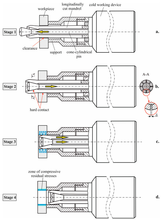 Cold working is realized by the axial movement of the mandrel together with the conical–cylindrical pin, such that the working conical and cylindrical surfaces of the mandrel are moved along the pre-drilled hole’s axis, deforming the hole plastically (Figure 2c).