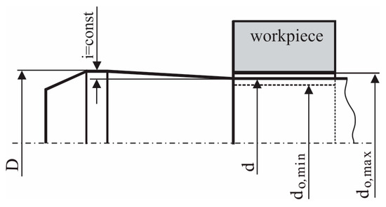 To compensate for the clearance, the conical–cylindrical pin is moved axially until its conical surface contacts the conical surface of the hole in the mandrel, causing the mandrel segments to move radially outward, resulting in a hard contact between the mandrel and the hole surface (Figure 2b). In this position, the major diameter D (Figure 3) of the mandrel’s working cylindrical surface is larger than the diameter of the pre-drilled hole in the workpiece. The presence of hard contact achieves constant tightness during the cold-working process since the tightness depends only on the difference between the mandrel’s major diameter D and the diameter d of its cylindrical surface (Figure 3).