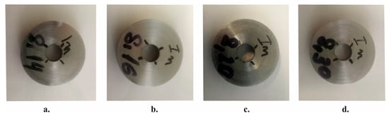 The experimental specimens were bushing type with the following nominal overall dimensions: outer diameter D = 32 mm and thickness . To evaluate the influence of the scattering of the pre-drilled hole diameter, the tests were carried out on four samples whose holes were successively drilled and reamed to obtain the following nominal diameters : 8.14, 8.16, 8.20, and 8.30 mm (Figure 6). After cold working, the holes were further machined by sequential reaming to obtain the following diameters: 8.4, 8.5, and 8.6 mm. Thus, the influence of the thickness of the metal’s cut layer around the stressed holes on the redistribution (evolution) of residual hoop stresses could be evaluated in correlation with the diameters .