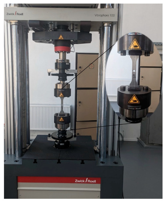 The mechanical characteristics of the aluminum alloy were established via a one-dimensional tensile test on the flat specimens using a Zwick/Roell Vibrophore 100 testing machine. The specimen dimensions are in accordance with ASTM E 466-07 and shown in Figure 4. The sample thickness was 5 mm. To evaluate the effect of the presence of a central hole, the mechanical tensile tests were carried out for two cases—without and with a central hole with a nominal diameter of 8.5 mm. The result for each group was established as the arithmetic mean obtained from three specimens showing that the presence of a central hole has little influence on the static mechanical characteristics of the studied alloy (Table 2).